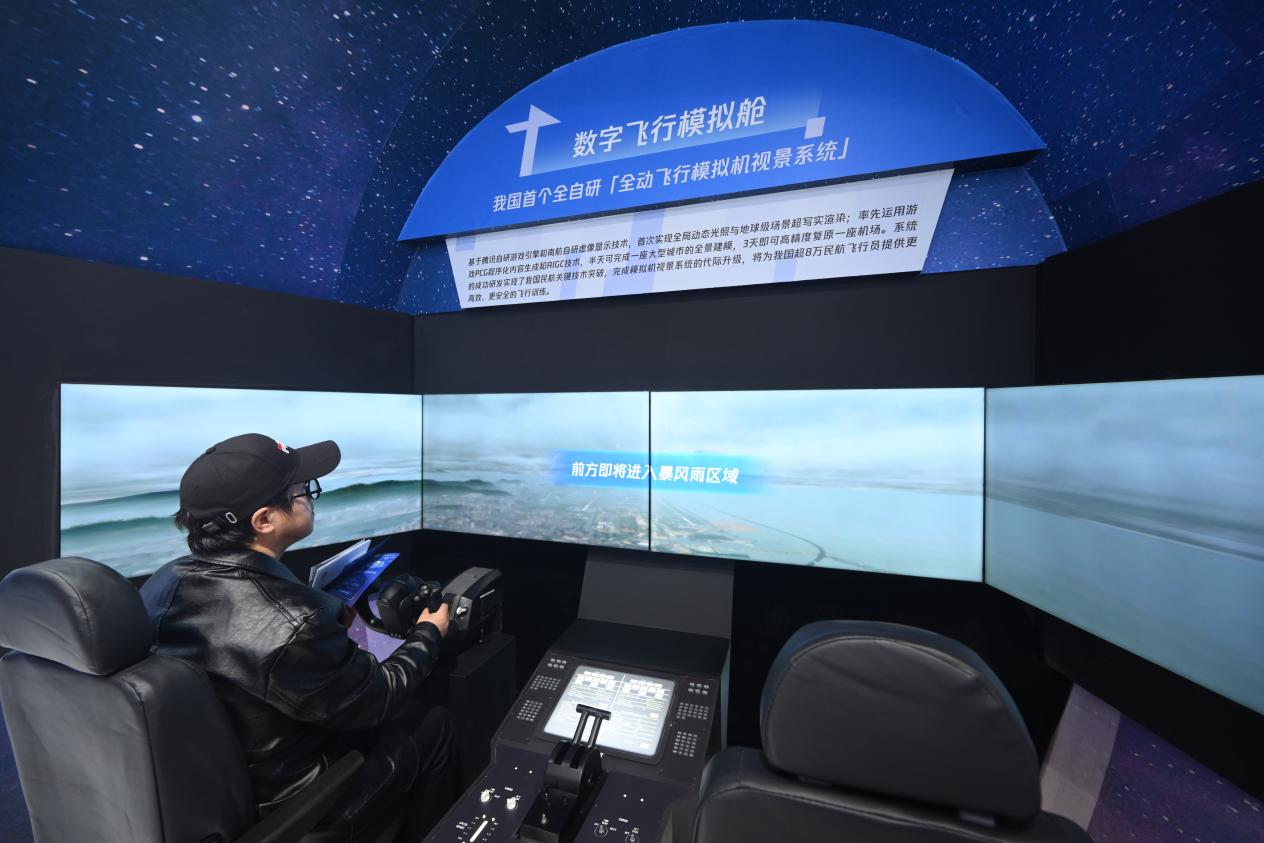 “只需要推動(dòng)操縱桿,就能操作系統(tǒng),體驗(yàn)民航飛行員第一視角下、擬真的訓(xùn)練場(chǎng)景……”在展區(qū)前方,由南航自研虛像顯示技術(shù)和騰訊自研游戲引擎技術(shù)共同打造的全動(dòng)飛行模擬機(jī)視景系統(tǒng),吸引眾多參觀者體驗(yàn)。基于騰訊自研游戲引擎,系統(tǒng)首次實(shí)現(xiàn)全局動(dòng)態(tài)光照與地球級(jí)場(chǎng)景超寫實(shí)渲染,多邊形生成面數(shù)較之前提升380倍、貼圖精細(xì)度提升100倍,助力實(shí)現(xiàn)我國(guó)民航關(guān)鍵技術(shù)突破。