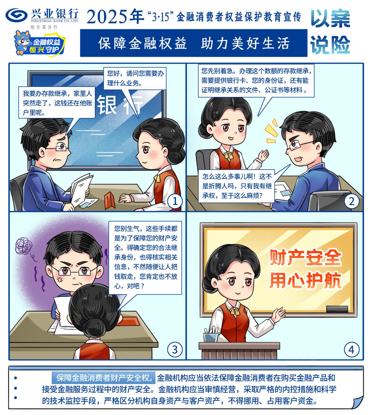 “保障金融權益 助力美好生活”,興業(yè)銀行哈爾濱分行2025年“3·15”金融消費者權益保護宣傳活動進行中,本期向您介紹金融消費者八項權益中的財產(chǎn)安全權。