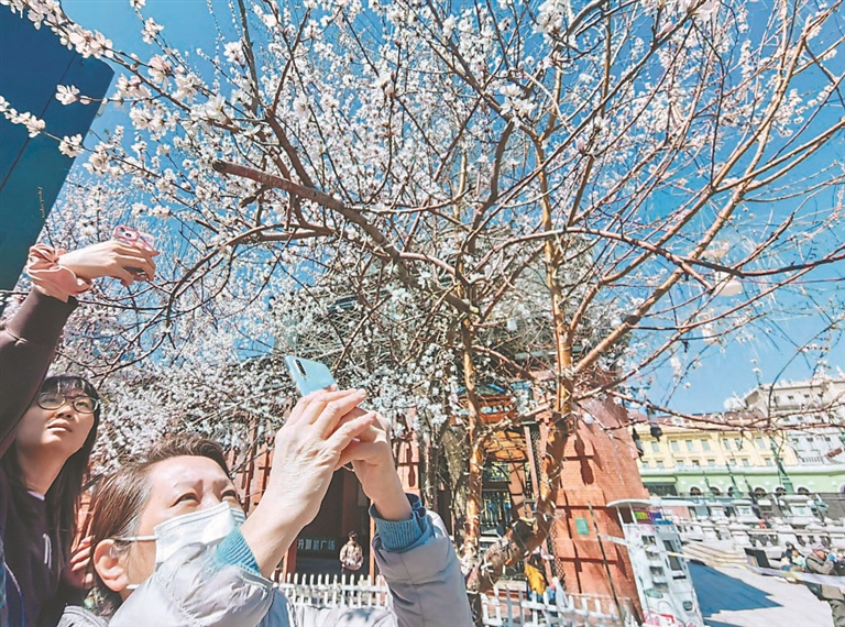 近日,哈爾濱市天空晴朗,空氣優(yōu)良,人們紛紛外出活動(dòng),盡享美好的春光。在松花江畔、中央大街、建筑藝術(shù)廣場(chǎng),市民游客有的在觀賞美麗江景,有的在逛街購(gòu)物,有的在拍攝盛開的桃花。