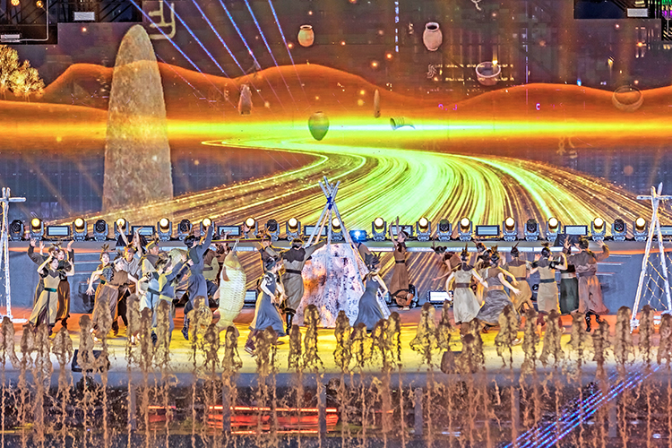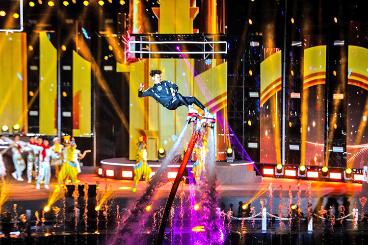 夜幕降臨,松花江江面瞬間化作光影的畫(huà)布。彩排現(xiàn)場(chǎng),水幕、噴泉、激光秀、無(wú)人機(jī)等特效輪番登場(chǎng),交相輝映;光影與旋律交織,歷史故事通過(guò)鮮活的影像在觀眾眼前徐徐展開(kāi)。演員們精湛的表演,配合著“人、聲、光、水、電、影、景”的深度融合,讓整個(gè)演出現(xiàn)場(chǎng)充滿了震撼力與感染力。