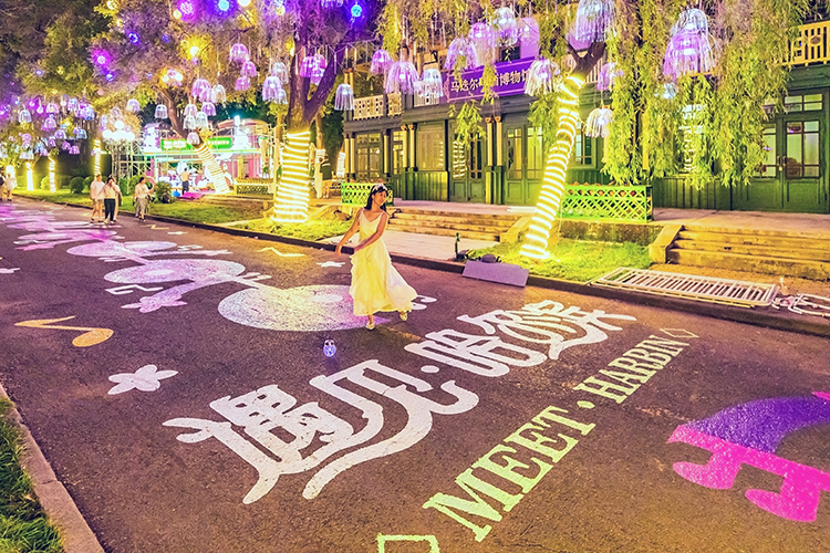 傍晚時(shí)分,通往演出現(xiàn)場(chǎng)的《遇見(jiàn)·哈爾濱》網(wǎng)紅街,也吸引了眾多游客駐足打卡。整條街道的地面,通過(guò)彩繪表現(xiàn)“浪漫”“愛(ài)情”和“遇見(jiàn)·哈爾濱”三大主題,滿是手繪的愛(ài)心和繽紛花朵,路兩旁的樹(shù)上還精心布置了玫瑰花束和水母燈,直接將浪漫值拉滿。游客們擺出或站、或坐、或跳起等姿勢(shì),無(wú)需修圖,隨手一拍都是浪漫大片。網(wǎng)紅街不僅好拍,更精彩、好看。