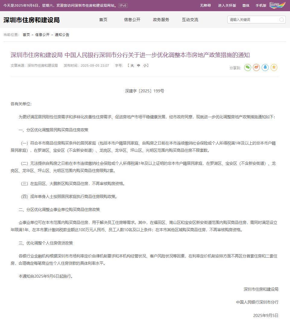 為進(jìn)一步滿足居民住房需求,促進(jìn)房地產(chǎn)市場(chǎng)平穩(wěn)健康發(fā)展,深圳市自2025年9月6日起優(yōu)化調(diào)整房地產(chǎn)政策,鹽田區(qū)、大鵬新區(qū)購買商品住房不再審核購房資格,其他部分區(qū)域也大幅放寬限購條件。