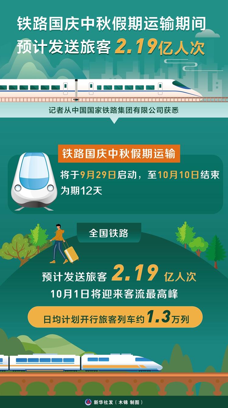 新華社北京9月28日電(記者樊曦)記者從中國(guó)國(guó)家鐵路集團(tuán)有限公司獲悉,鐵路國(guó)慶中秋假期運(yùn)輸將于9月29日啟動(dòng),至10月10日結(jié)束,為期12天,全國(guó)鐵路預(yù)計(jì)發(fā)送旅客2.19億人次,10月1日將迎來客流最高峰,日均計(jì)劃開行旅客列車約1.3萬(wàn)列。