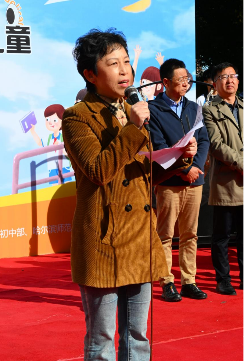 受贈方香坊區(qū)幸福鎮(zhèn)哈藥希望小學校長劉壯現(xiàn)場介紹了這所希望小學留守兒童的情況。開幕式最后,黃磊理事長和張靜萍書記一同敲響大鑼,鳴鑼開市。