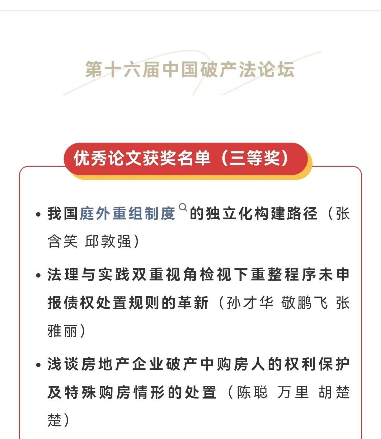 黑龍江經(jīng)濟網(wǎng)訊(董慧瑩 李雪松)近日,第十六屆中國破產(chǎn)法論壇在京舉辦。本屆論壇由中國人民大學(xué)法學(xué)院、中國人民大學(xué)破產(chǎn)法研究中心、北京市破產(chǎn)法學(xué)會、北京破產(chǎn)法庭共同主辦。經(jīng)過論壇組委會層層遴選及第三方專家評審,最終評出一等獎58篇,二等獎95篇,三等獎127篇,優(yōu)秀獎62篇。其中,肇東市人民法院黨組成員周麗華、立案庭法官助理李旭東、審管辦書記員王岳共同撰寫的論文《房產(chǎn)企業(yè)破產(chǎn)程序中預(yù)告登記法律效力研究》在1300篇論文中脫穎而出,榮獲三等獎。