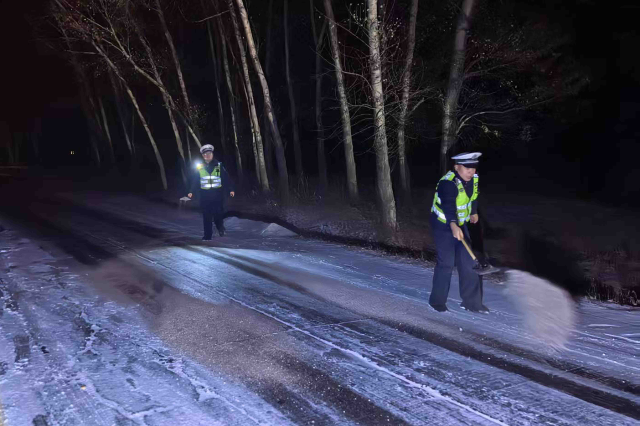 工作中,民輔警重點(diǎn)對(duì)坡道、彎道、橋梁等易結(jié)冰路段進(jìn)行巡查,針對(duì)國道坡度較大、彎道較多、易滑的結(jié)冰路段,采用“定點(diǎn)潑灑+動(dòng)態(tài)巡邏補(bǔ)撒”的方式,使用鐵鍬、掃帚等工具,向結(jié)冰路面均勻潑灑工業(yè)鹽、撒布防滑沙等防滑料,進(jìn)一步增強(qiáng)路面摩擦力,防止車輛打滑,確保路面盡快恢復(fù)安全通行條件,有效遏制交通事故的發(fā)生,全力保障群眾出行安全。同時(shí),民輔警采取定點(diǎn)執(zhí)勤與流動(dòng)巡邏相結(jié)合的方式,加強(qiáng)路面巡邏管控和指揮疏導(dǎo),利用喊話器積極提醒過往車輛保持安全車距,減速慢行,謹(jǐn)慎駕駛,確保行車安全。