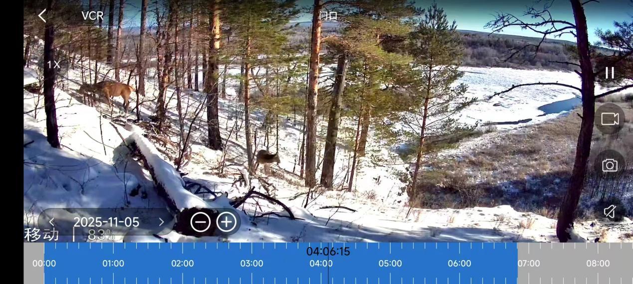 監(jiān)控畫面中,狍子時而低頭啃食積雪下的草本植物與木本嫩枝,時而抬頭警覺張望,盡顯食草動物的溫順靈動。猞猁則步伐穩(wěn)健,目光銳利卻不張揚,構(gòu)成了一幅難得的野生動物同框畫卷。作為東北林區(qū)常見的野生動物,狍子能耐受-60℃的嚴(yán)寒,而猞猁的出現(xiàn),更印證了當(dāng)?shù)厣鷳B(tài)系統(tǒng)的完整性。