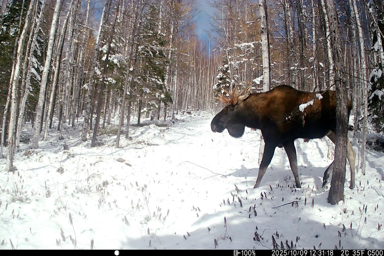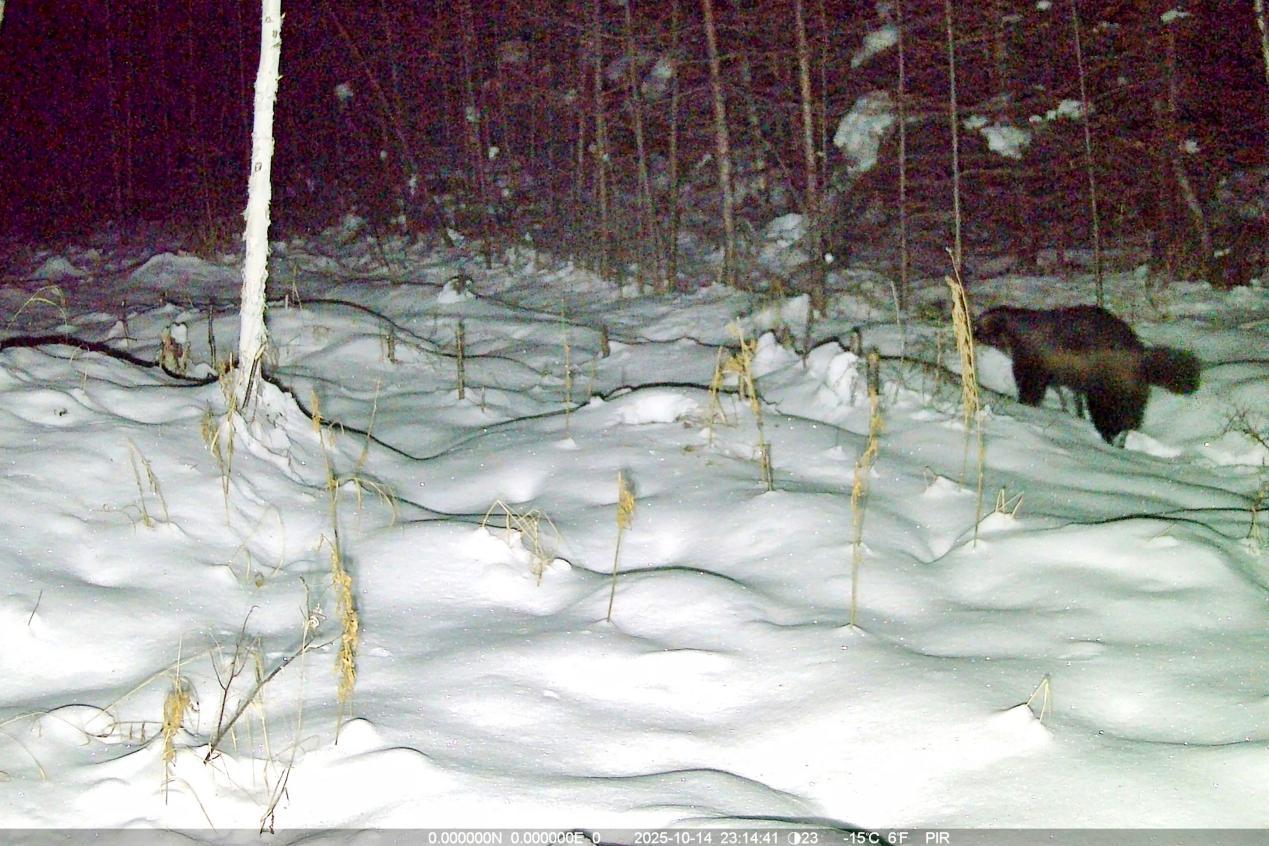 項目實施中,工作人員克服地形復雜、嚴寒天氣等挑戰(zhàn),深入森林公園腹地完成15條冬季樣線調查,并同步開展97臺紅外相機的維護與回收工作,累計獲取了大量珍貴野生動物影像資料及活動數據。監(jiān)測范圍內,駝鹿、原麝、貂熊、紫貂、猞猁、棕熊、馬鹿、花尾榛雞等國家重點保護野生動物相繼現身,更捕捉到原麝覓食、棕熊帶崽等罕見畫面,直觀印證了森林公園內棲息地質量優(yōu)良、生態(tài)保護成效顯著。