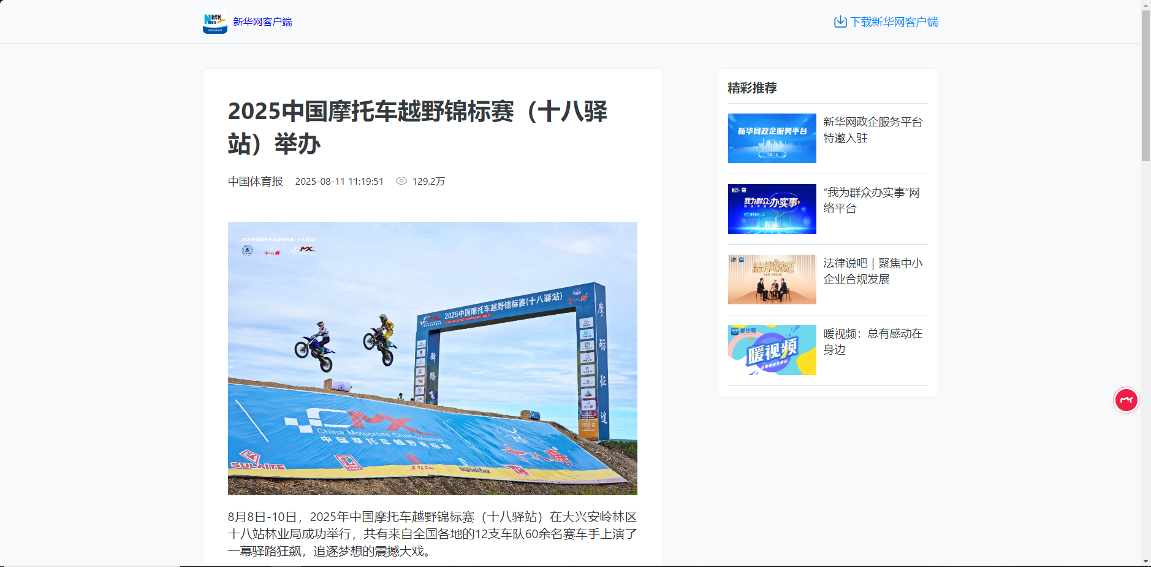 ——主題宣傳聲勢(shì)強(qiáng)勁,上央媒、亮品牌。聚焦生態(tài)建設(shè)、產(chǎn)業(yè)發(fā)展、先進(jìn)典型等,深挖工作亮點(diǎn),全媒體發(fā)稿量超3800篇,其中國(guó)家級(jí)媒體310余篇、省級(jí)媒體270余篇?!?025中國(guó)摩托車(chē)越野錦標(biāo)賽舉辦》《小熊下樹(shù)!哎喲喲下得挺快》等作品登上央視新聞、新華社、光明網(wǎng)、學(xué)習(xí)強(qiáng)國(guó)、中國(guó)綠色時(shí)報(bào)等國(guó)家級(jí)平臺(tái);2025中國(guó)摩托車(chē)越野錦標(biāo)賽、文藝演出等活動(dòng)通過(guò)新華社現(xiàn)場(chǎng)云等平臺(tái)直播,總點(diǎn)擊量超300萬(wàn)次,“十八驛站”知名度與美譽(yù)度顯著提升。