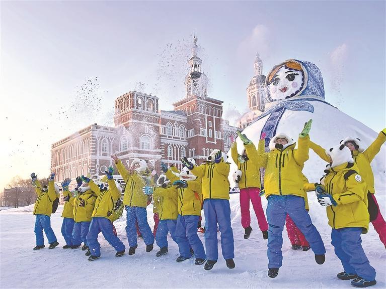 來自四川的研學(xué)團(tuán)隊在哈爾濱伏爾加莊園揚雪嬉戲。