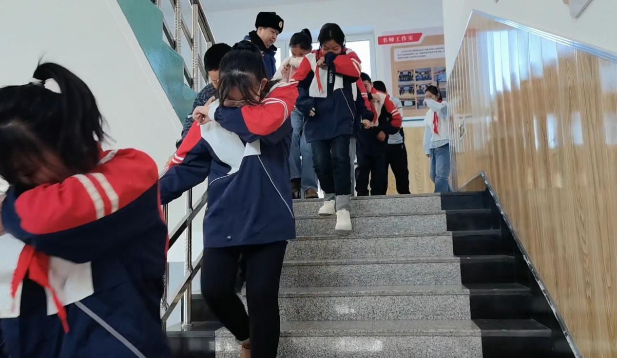 學(xué)生們?cè)谙佬麄鲉T與班主任的指引下有序開(kāi)展應(yīng)急疏散演練(胡春磊 攝)