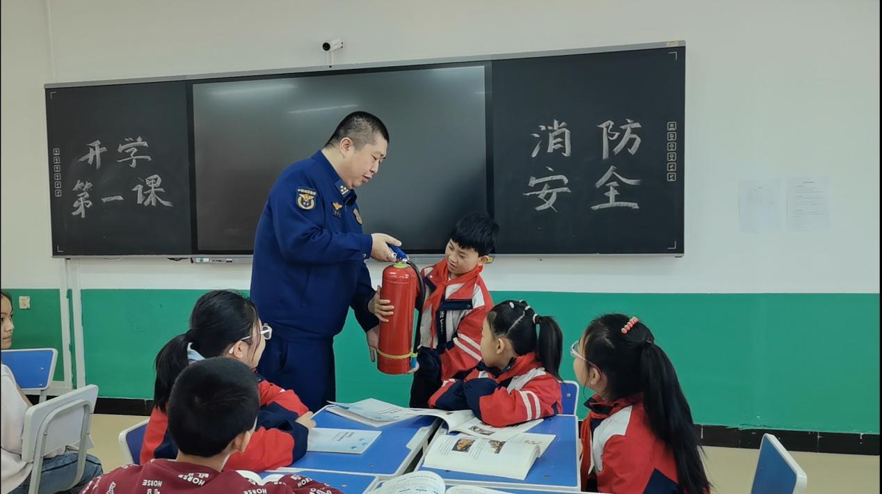消防宣傳員在課堂上講解《中小學(xué)生消防安全讀本》中的消防安全常識(shí)(胡春磊 攝)